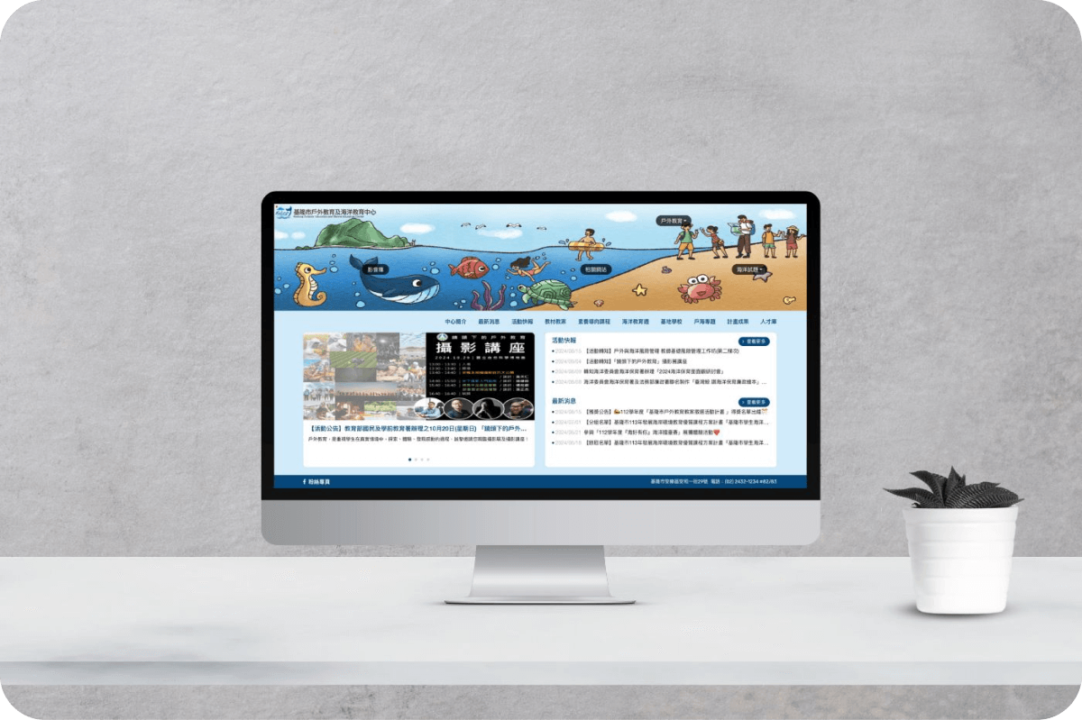 網站以童趣的插畫風格,展現海洋與沙灘的活力,邀請民眾深入探索精彩的活動、教材教案、素養課程、計畫成果等學習資源。